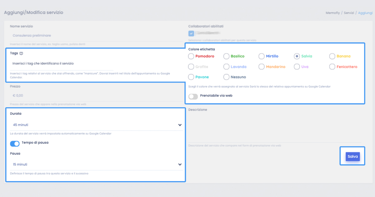 Nella schermata precedente vedi la pagina in cui puoi creare il tuo servizio. Memofly è personalizzabile e flessibile, la compilazione del servizio può arricchirsi di alcune opzioni utili alla tua organizzazione. Vediamo assieme tutti i campi: