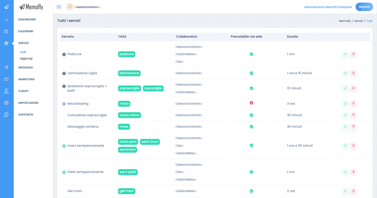 Puoi consultare tutti i servizi inseriti cliccando sulla voce “Servizi > Tutti” nel menu sulla sinistra. Vedrai l’elenco dei tuoi servizi con: Nome del servizio, Tag, Collaboratori, Prenotabile via web, Durata. Puoi modificare un servizio cliccando sull’icona matita verde presente sulla destra presenti in ogni riga per ogni servizio. Per cancellare il servizio clicca sull’icona cestino rosso.